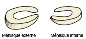 En haut se trouve le fémur, l’os de la cuisse. En bas, il y a le tibia, l’os de la jambe. Le bas du fémur est plutôt rond et le haut du tibia apparaît beaucoup plus plat. Les ménisques sont des petites cales situées entre les deux os du genou.