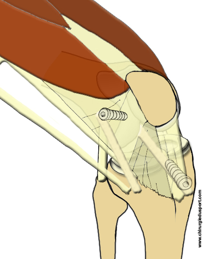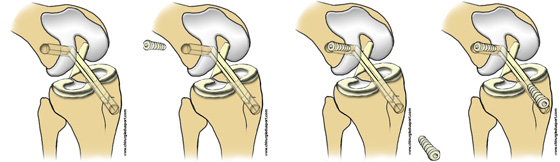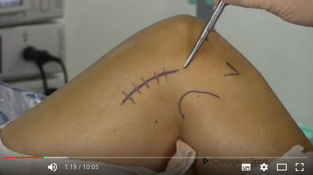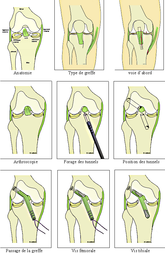 Intervention chirurgicale: Le principe de l’opération est de réparer le ligament croisé antérieur (LCA) rompu par une autogreffe os tendon os prélevée sur le tendon rotulien. Intervention réalisé sous anesthésie locorégionale ou générale avec un garrot.